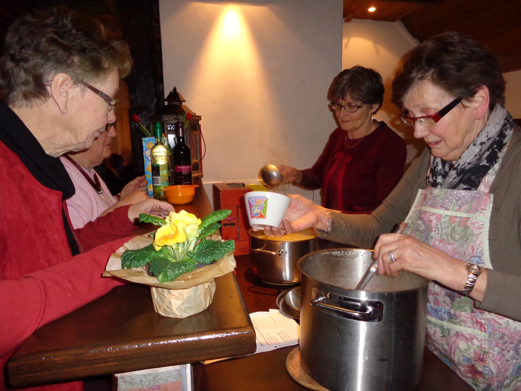 Toen de soep klaar was, werd er uitgedeeld, en iedereen mocht er een bord van nemen, want iedereen had ook iets van zijn eigen voorraad gegeven om de soep te kunnen maken.