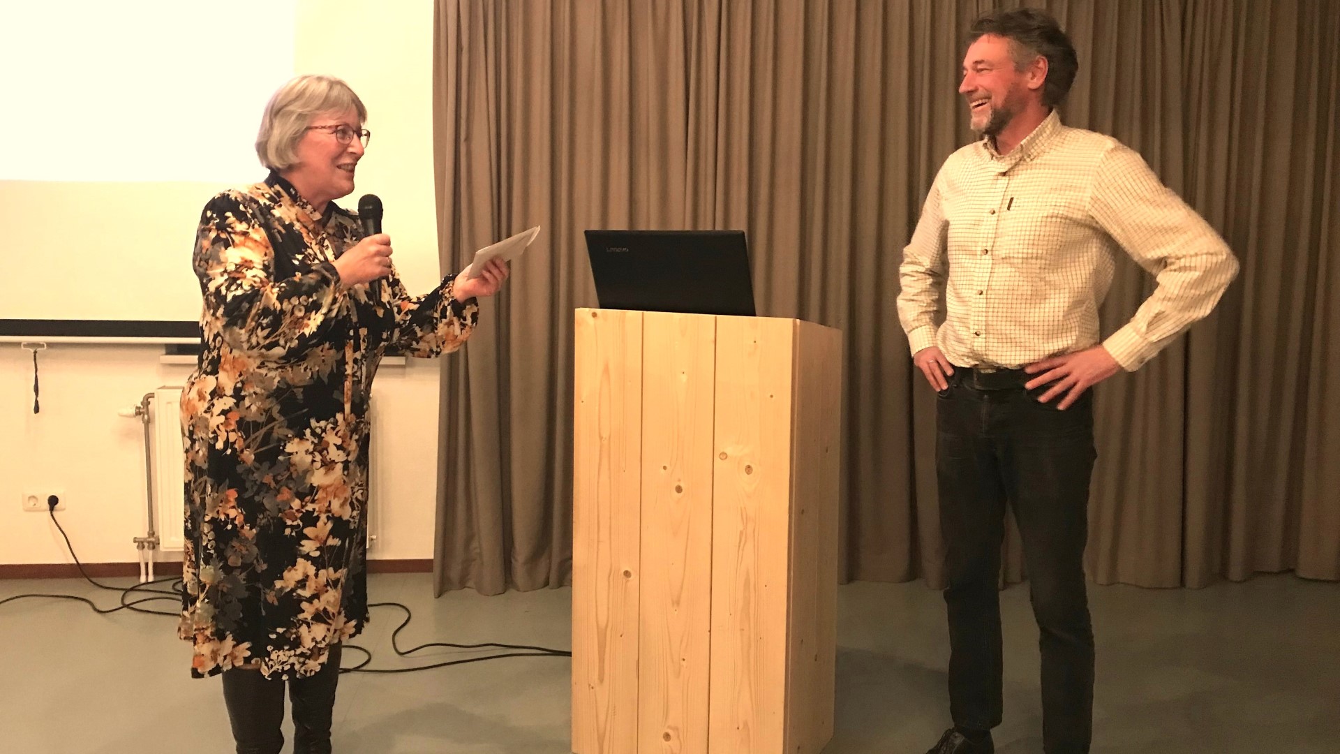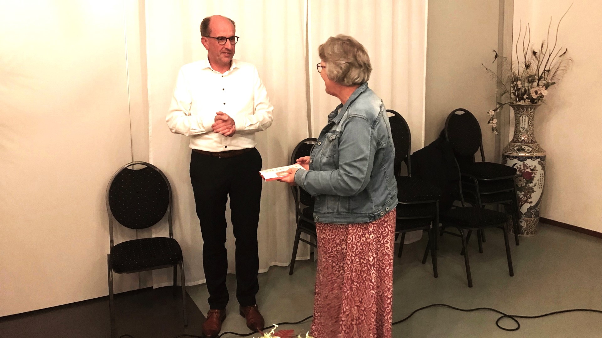 Evelien bedankt hem met chocolaatjes. Namens de Schakel is er een gift worden overgemaakt naar de Stichting De Ondergrondse Kerk.
