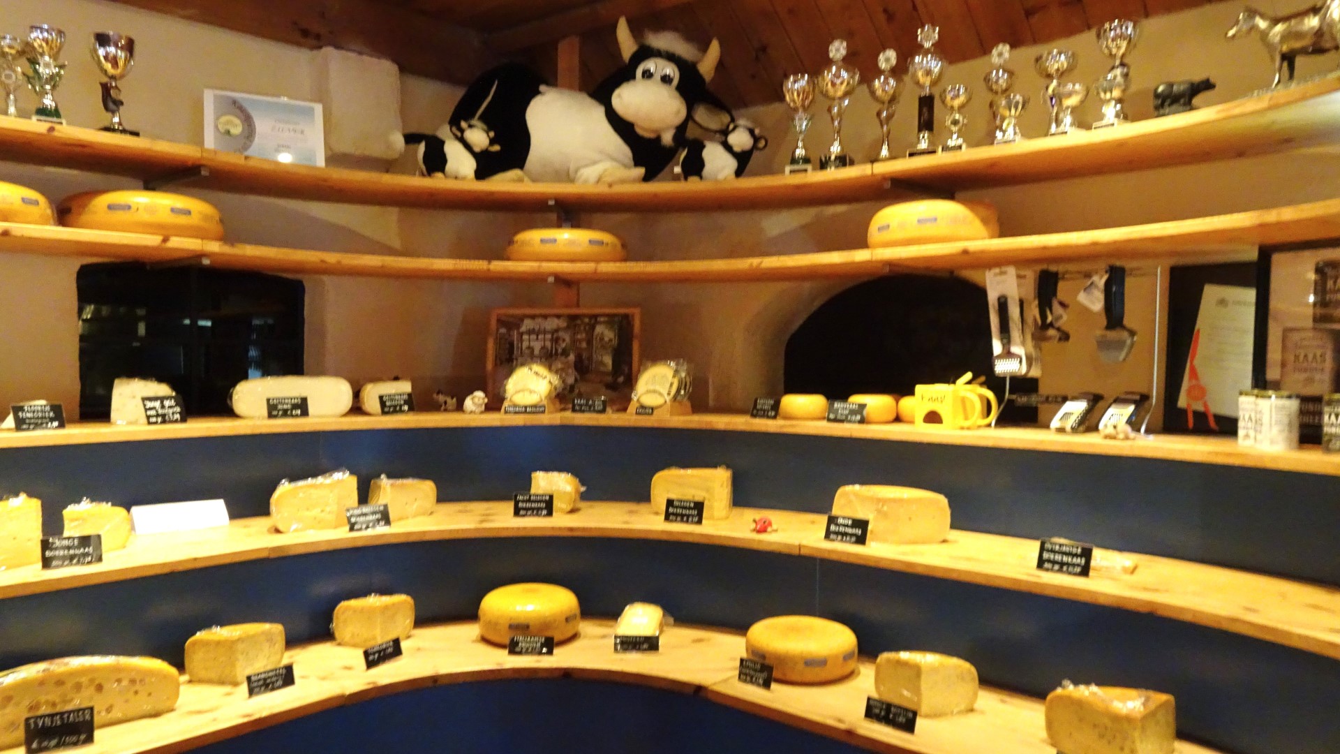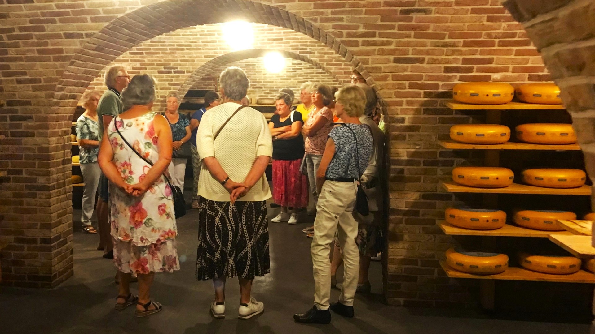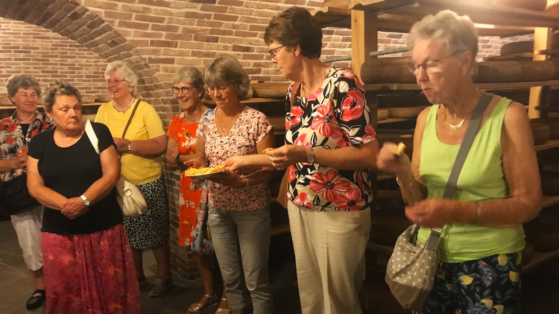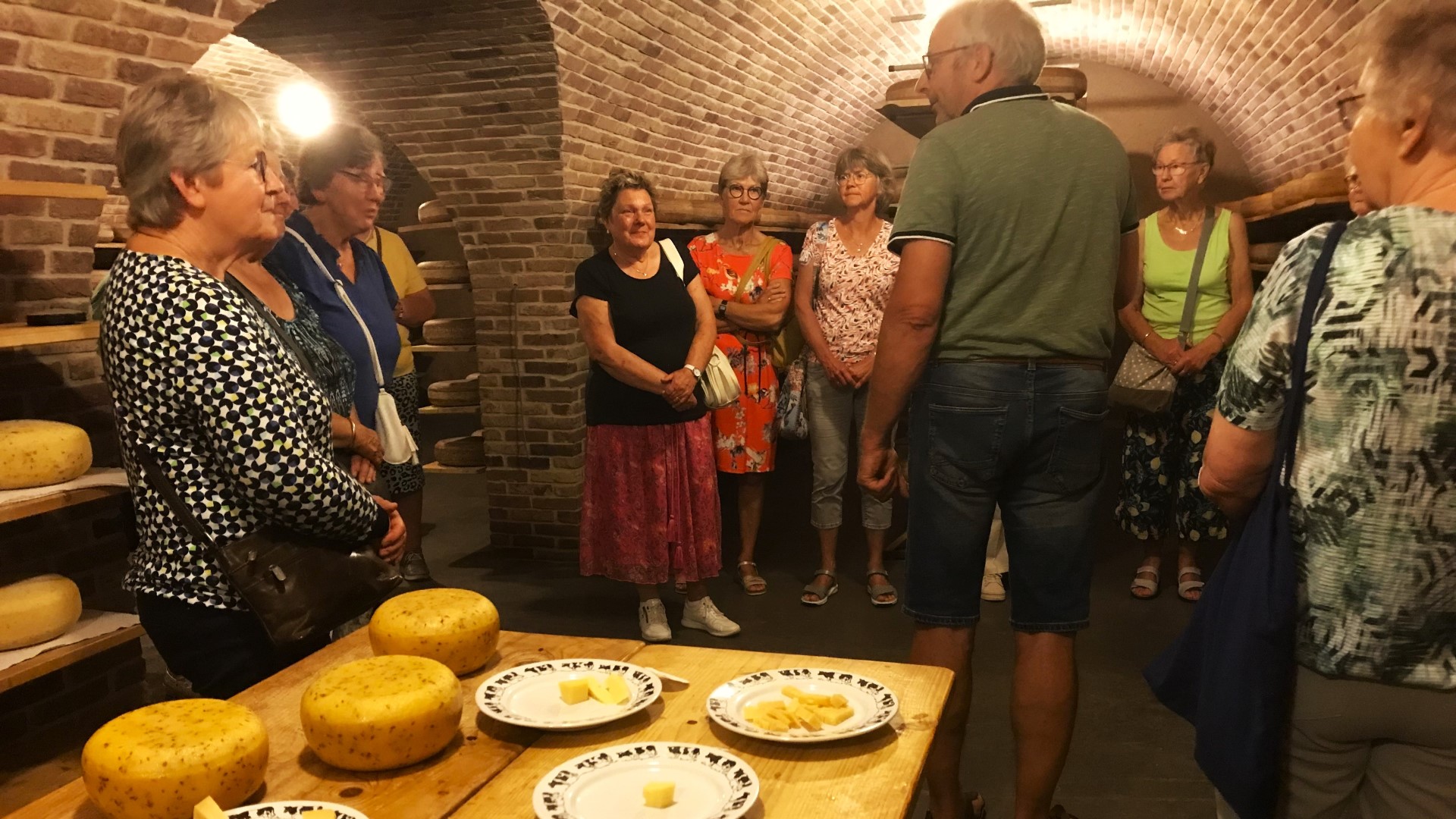 Onder die koeienstal bleek zich een grote koele kelder te bevinden waar heel veel kazen lagen te rijpen. We mochten daar ook verschillende soorten kazen proeven.