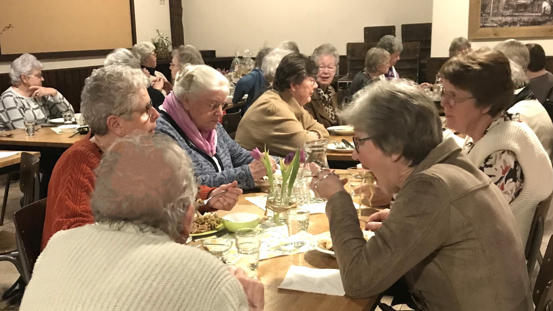Daar waren er enkele dames bijgekomen. Na een welkomstdrankje op het terras zaten we binnen met 23 personen aan 3 tafels.