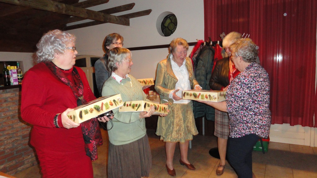 Ook de dames van het bestuur werden verrast. Niet met een bloemetje maar met een goed gevulde doos met verschillende streekprodukten.