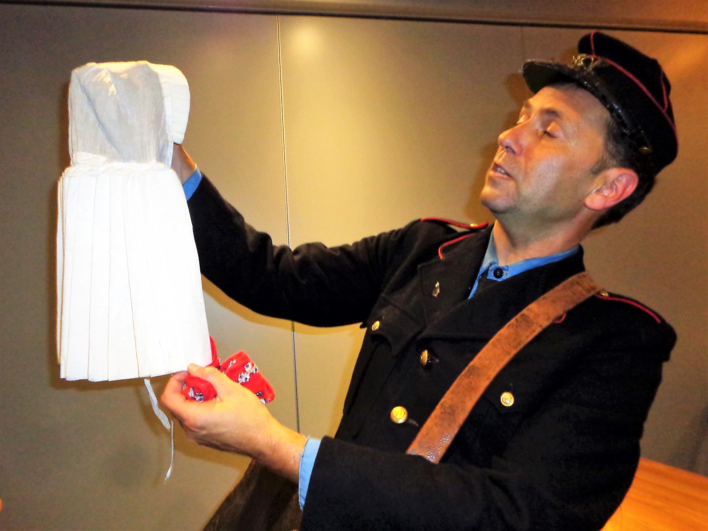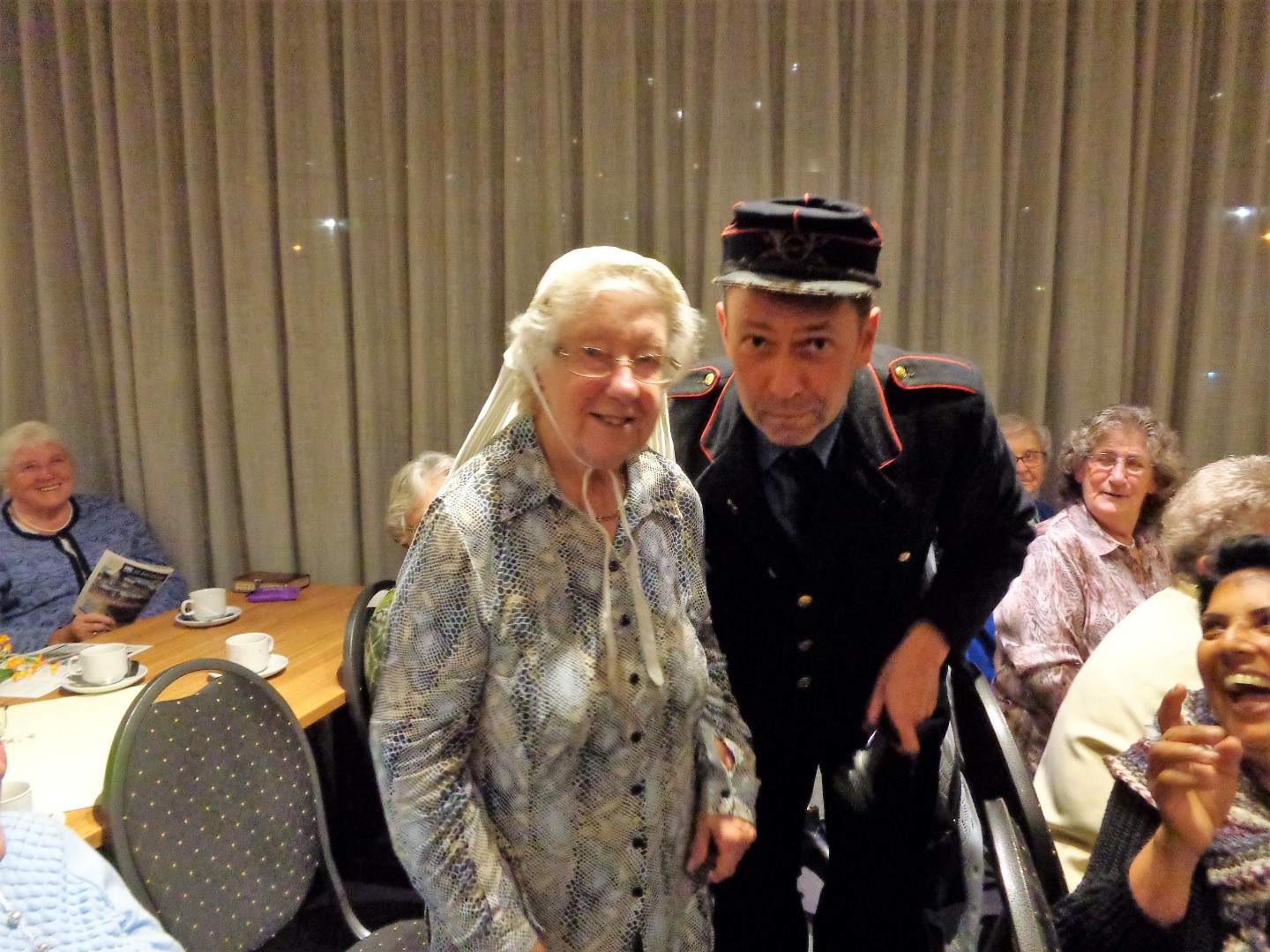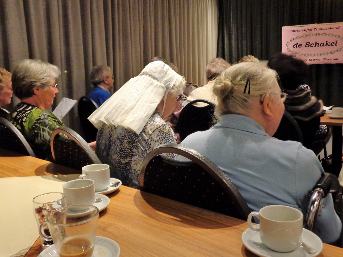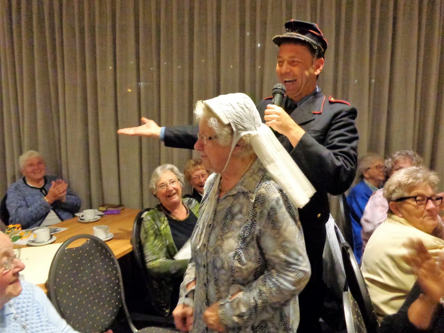 Na de pauze verteld Jobje weer verder. Een van onze leden komt oorspronkelijk uit Lunteren. Zij kreeg een Lunterse kap op en daarna zongen we samen het Lunterse volkslied.