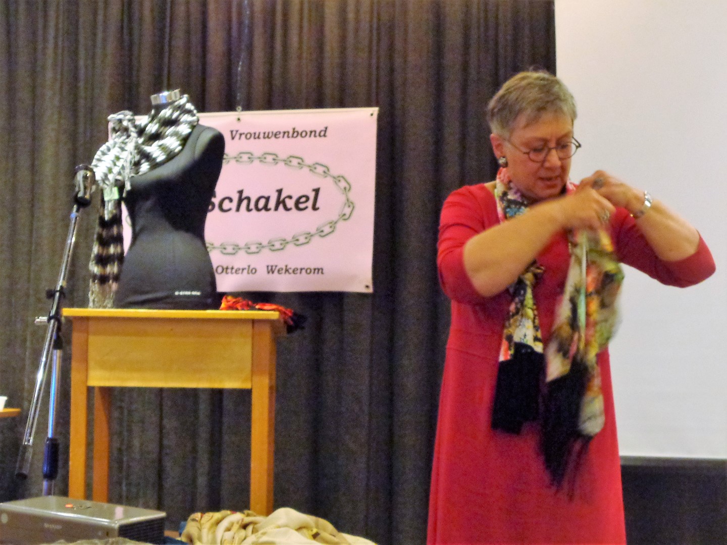 Zij kwam ons laten zien op welke manieren men sjaaltjes van verschillende afmetingen om kan knopen.