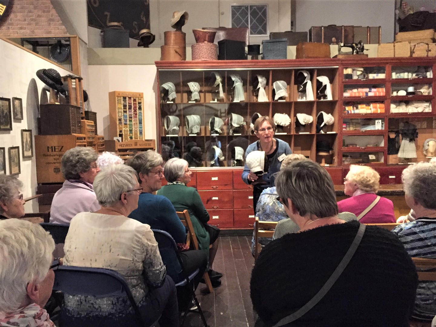 Na een koffiepauze werden we weer geroepen om te gaan zitten luisteren naar een mevrouw die ons vertelde over de verschillende mutsen die men vroeger voor allerlei gelegenheden droeg.