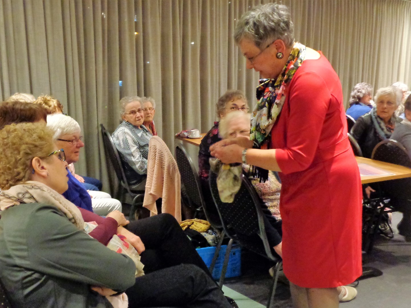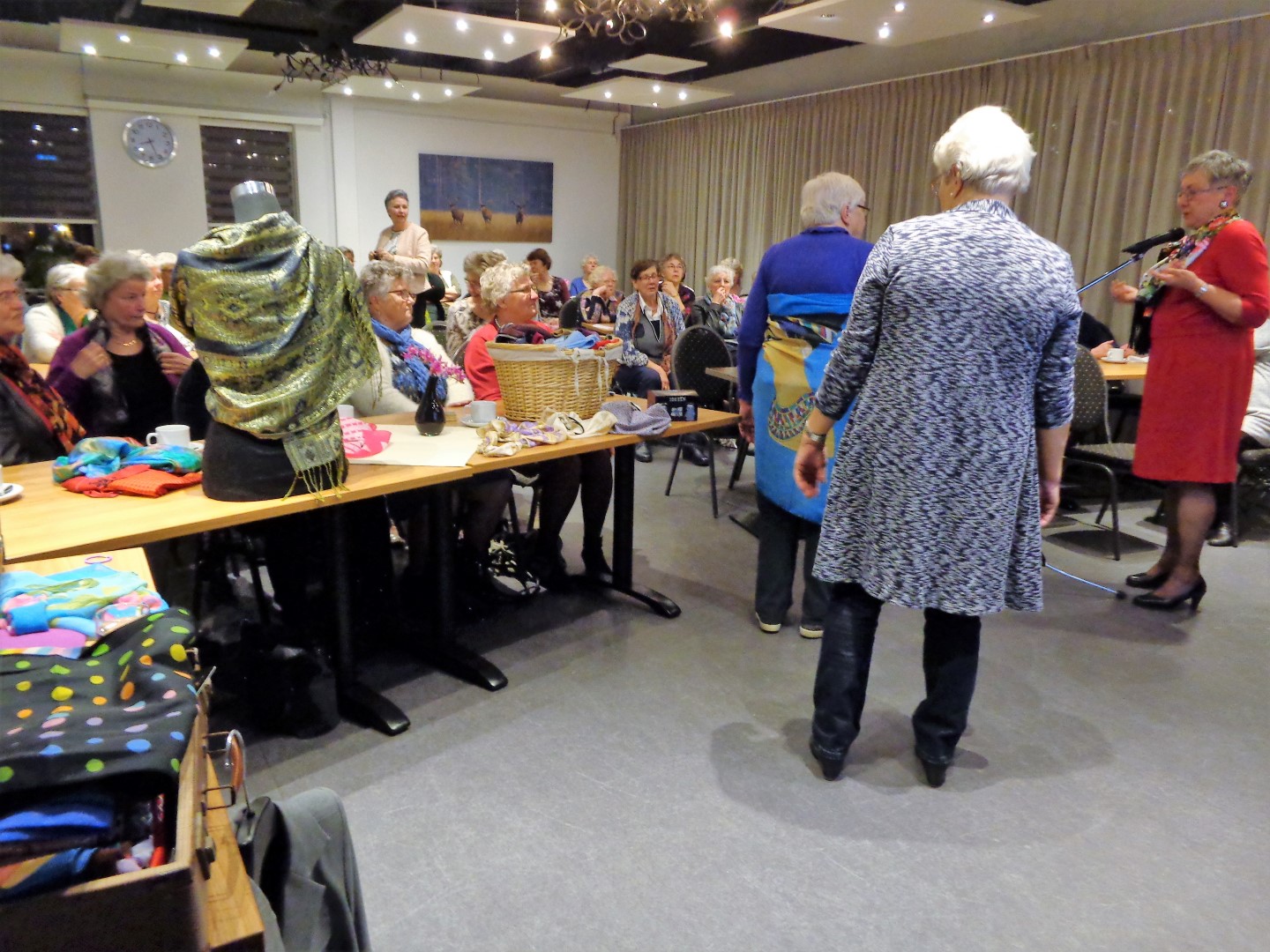 Zij kwam ons laten zien op welke manieren men sjaaltjes van verschillende afmetingen om kan knopen.